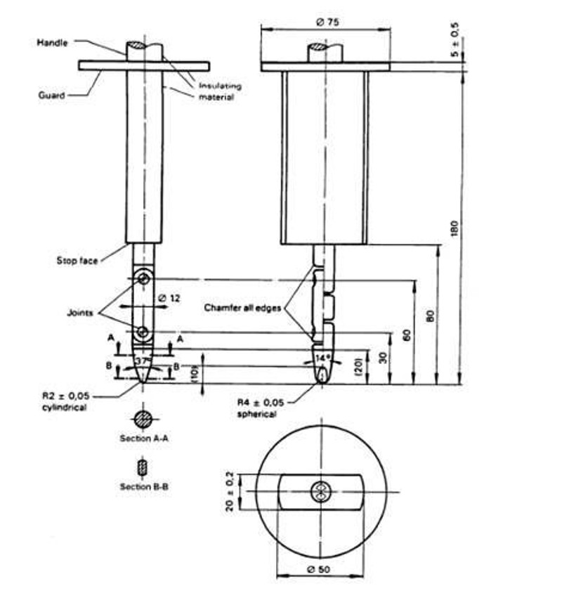 原先采用的帶有50mm圓形擋板的類似IEC 61032 中的 B型試驗(yàn)指 ( 見右圖), 不再被用來進(jìn)行判斷是否觸及危險(xiǎn)運(yùn)動部件。