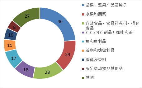 在被通報的農(nóng)食產(chǎn)品中,最多的依然是堅果/種子產(chǎn)品,占被通報的中國產(chǎn)食品總數(shù)的23.7%,其次為水果蔬菜、膳食補充劑和咖啡茶葉等(詳見表7、圖7)。