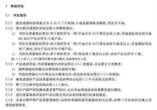 標(biāo)準(zhǔn)明確了等級評定的評定原則和評定指標(biāo)。其中,評定原則規(guī)定了燃具或部件的質(zhì)量分為A、B、C三個級別,A級質(zhì)量等級最高,其次為B級,再次為C級。