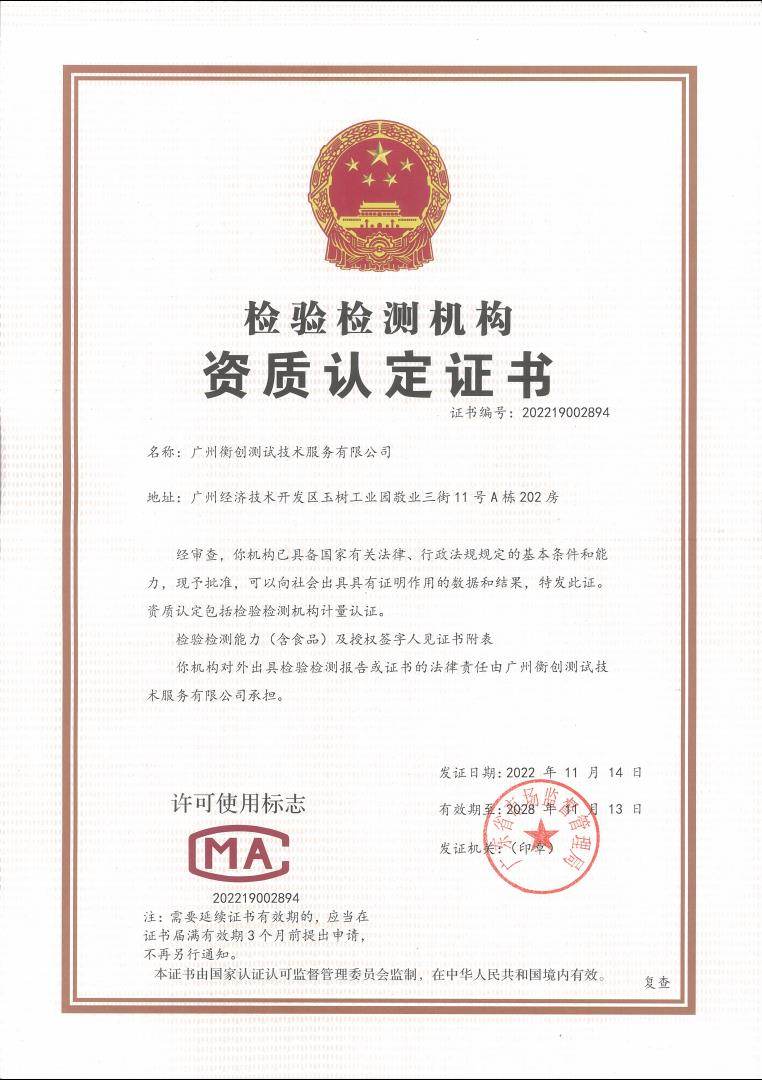CMA | 202219002894 | 在網(wǎng)頁的“認證機構(gòu)名錄”板塊查找“廣州衡創(chuàng)測試技術(shù)服務有限公司”便可查看資質(zhì) | ||