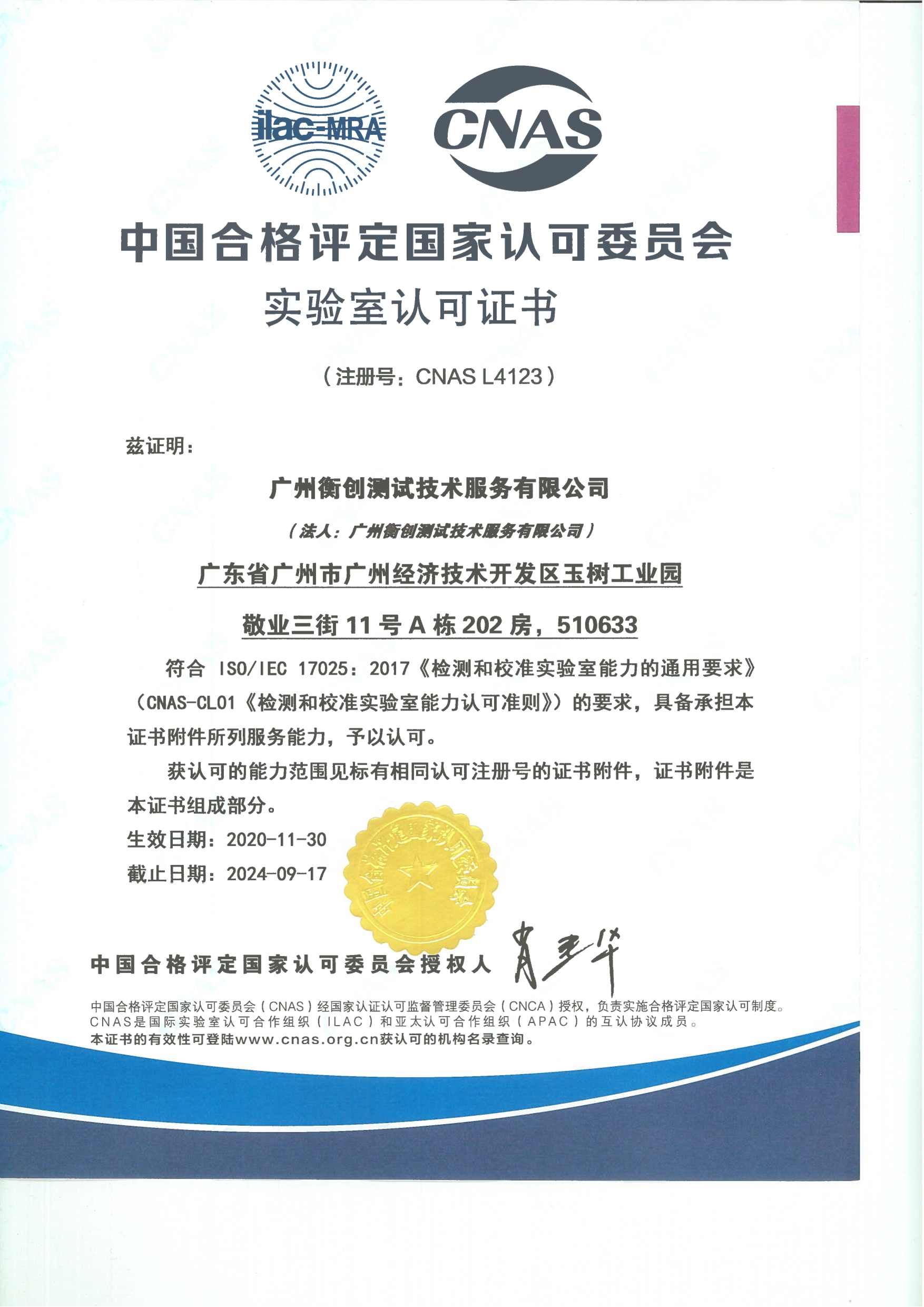 CNAS | CNAS L4123 | 在網(wǎng)頁的“認證機構(gòu)名錄”板塊查找“廣州衡創(chuàng)測試技術(shù)服務有限公司”便可查看資質(zhì) |